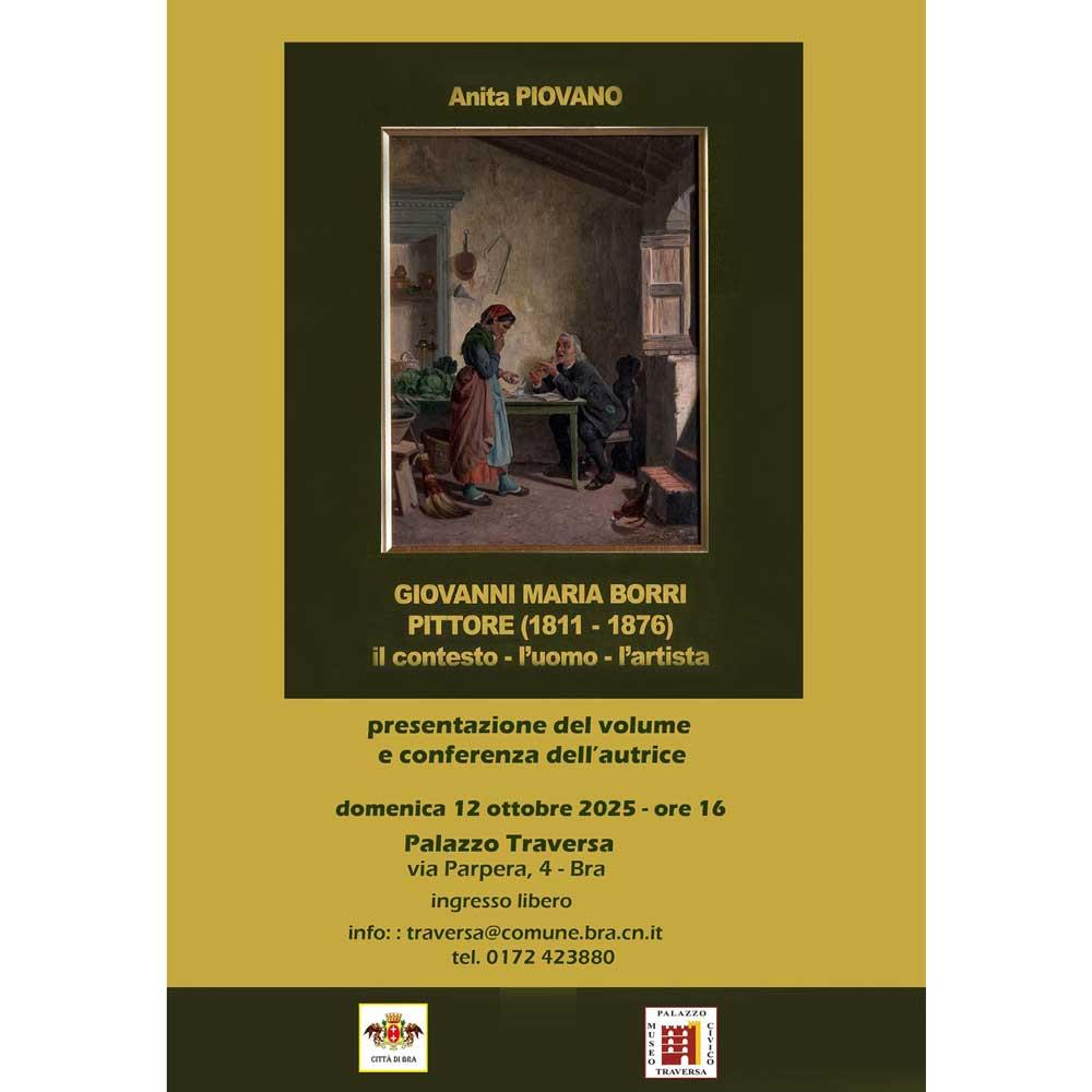 On Sunday, October 12, Professor Anita Piovano, author of the book "Giovanni Maria Borri, Painter (1811-1876). The Context - the Man - the Artist," will present it at Palazzo Traversa (4:00 PM). This will be an opportunity to showcase the fruits of her years of study and research, which have culminated in the creation of this work. The artist from Sommariva Bosco (two of whose paintings are on display in the Palazzo Traversa Museum) is outlined within the historical and geographical context of his origins, detailing his family background and retracing the key stages of his life and artistic career, beginning with his training at the Accademia Albertina in Turin, and highlighting his participation in exhibitions organized by the Turin Society for the Promotion of Fine Arts. The essay is accompanied by extensive and detailed photographic documentation of Borri's works, ranging from religious subjects to portraits and still lifes. The projection of the images composing the iconographic apparatus will accompany the presentation, facilitating knowledge and understanding of his artistic journey in its many facets.